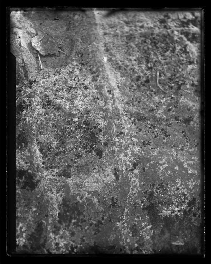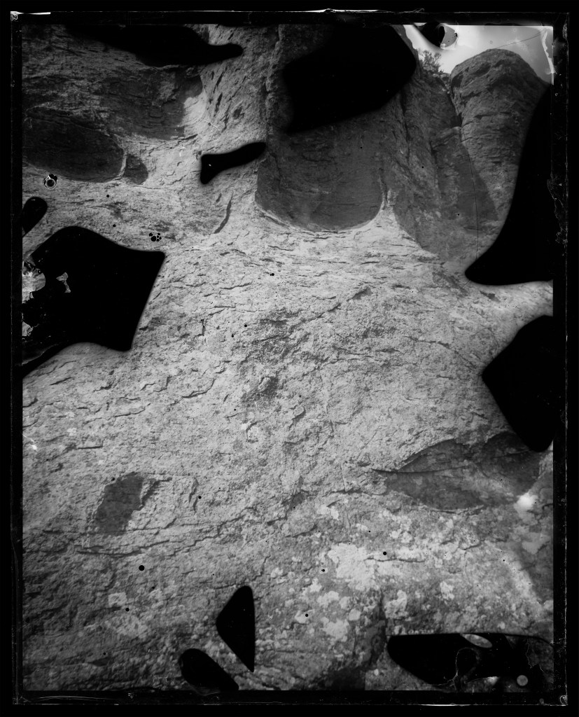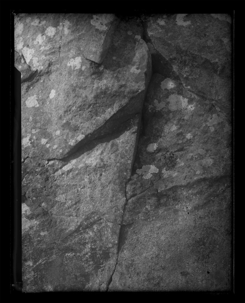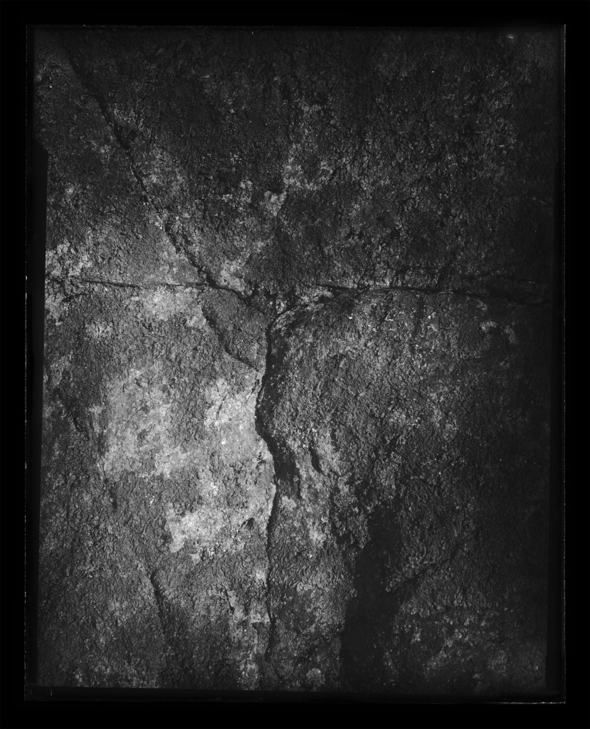 This ongoing series of rock surfaces is shot on glass plates hand-coated in silver gelatin emulsion. In these images, the weathered stone surfaces interact with the unpredictable surfaces of the image. The chemical and temporal processes that eroded both image and subject resist an illusory image/subject collapse, instead creating an image-as-object. This work captures time scales, massive and minuscule, of elemental change.