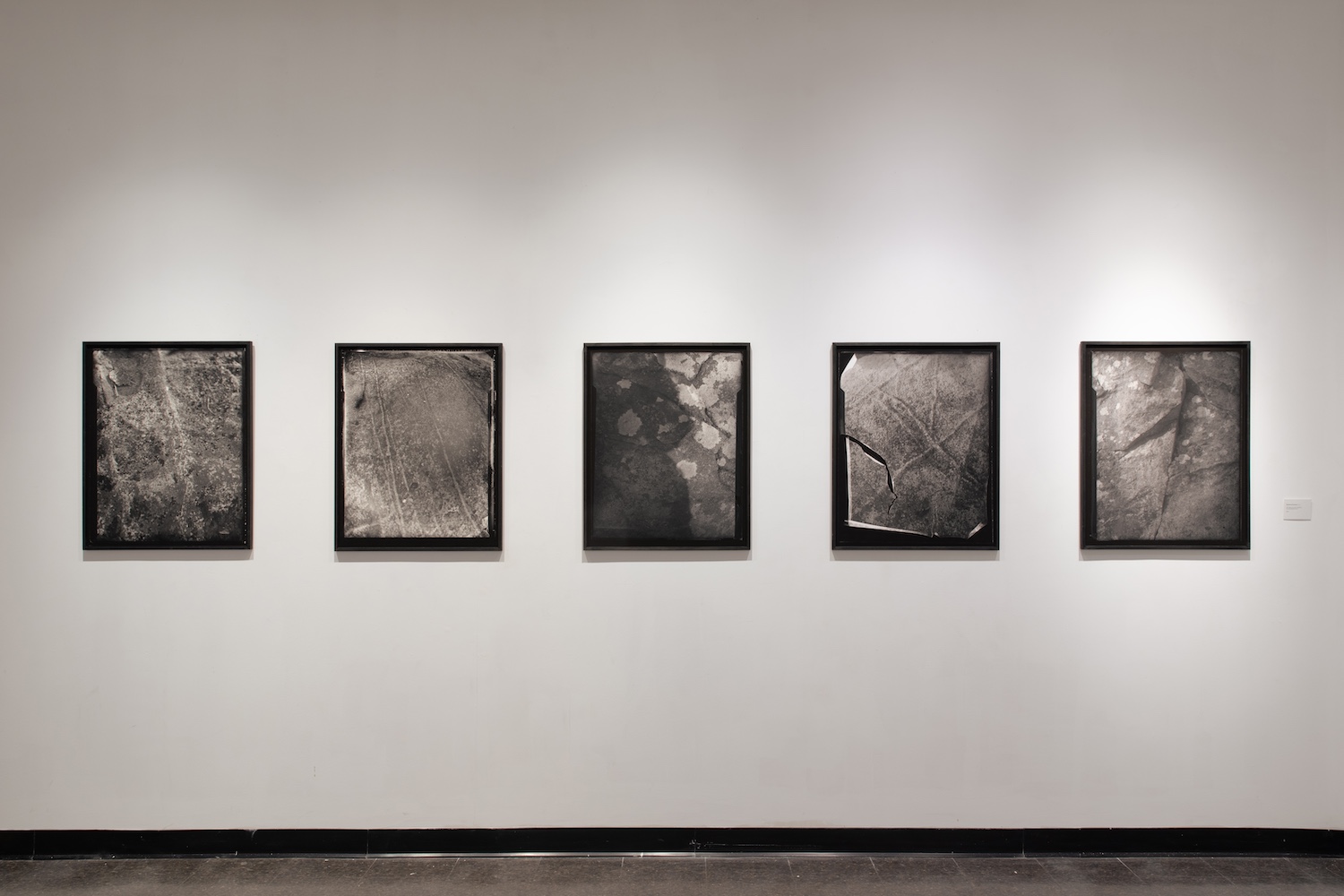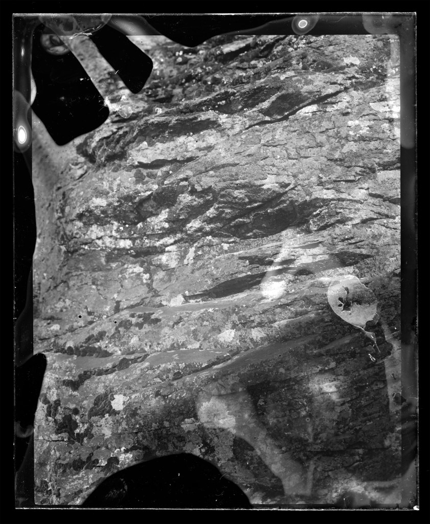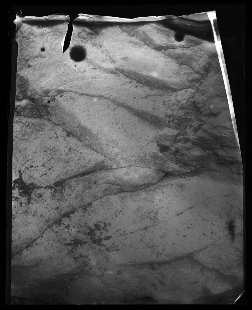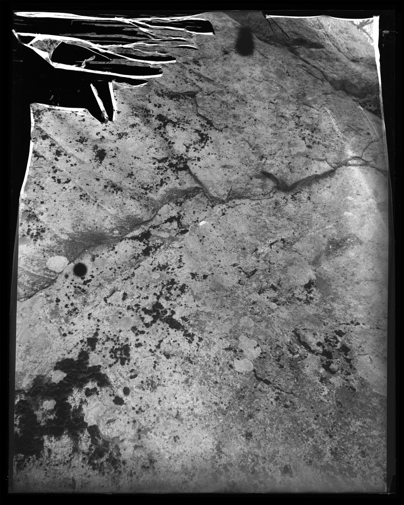 This ongoing series of rock surfaces is shot on glass plates hand-coated in silver gelatin emulsion. In these images, the weathered stone surfaces interact with the unpredictable surfaces of the image. The chemical and temporal processes that eroded both image and subject resist an illusory image/subject collapse, instead creating an image-as-object. This work captures time scales, massive and minuscule, of elemental change.