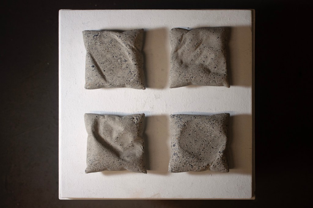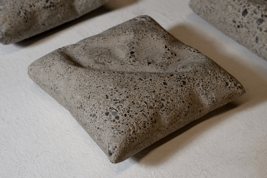 These concrete pillows were created using a physical-digital-physical process. Using reference images and 3D scans, I modeled my everyday items (glasses, phone, keys, and wallet), and performed cloth simulations to ‘impress’ them onto pillow models. 3D-printed molds brought the forms to the physical world in concrete, creating a sort of archeological evidence for my existence.